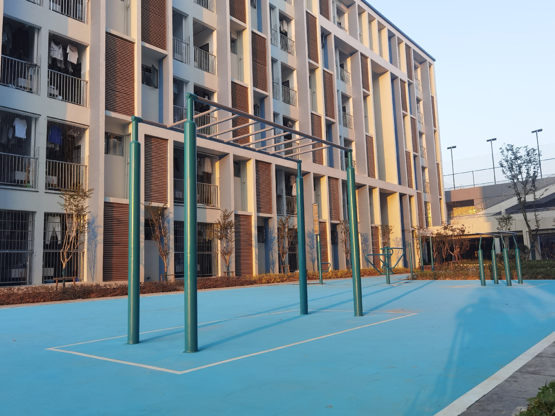 健身訓練區(qū):配置天梯、肋木架、單杠、雙人雙杠等器材。這些設施看似簡單,卻暗藏巧思:天梯的握桿間距符合人體工程學,助力學生鍛煉上肢力量;肋木架結合攀爬、壓腿等多功能設計,滿足不同訓練需求。